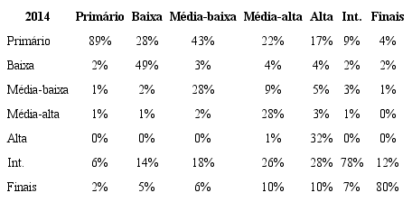Os resultados compilados na Tabela 2 também mostram que os subsistemas mais sofisticados em termos tecnológicos são os que apresentam maior participação do ramo de serviços intermediários no montante de horas trabalhadas, com destaque para a indústria de Alta intensidade tecnológica, 28%. Na sequência se encontram os subsistemas de Média-alta, 26%; Média-baixa, 18%, e Baixa intensidade, 14%. Serviços finais e o subsistema Primário são os que exibem as menores participações, 12% e 6%, respectivamente. Apesar do ramo de Serviços intermediários ser amplamente utilizado como insumo pelos subsistemas industriais o oposto não é válido. Isto é, os ramos industriais apresentam baixa participação direta e indireta no total de horas trabalhadas no subsistema de serviços intermediários, sendo as participações mais elevadas observadas para os ramos menos intensivos, a saber: os ramos industriais de Baixa, 3%, e Média-baixa, 3%, intensidade tecnológica.