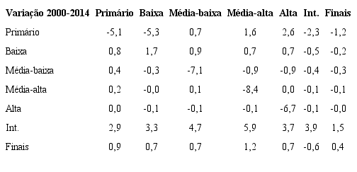 Por outro lado, o ramo de Baixa intensidade tecnológica exibe avanço na sua participação no subsistema Primário, 0,8 pontos percentuais, e nos subsistemas de Baixa, 1,7; Média-baixa, 0,9; Média-alta, 0,7; e Alta intensidade tecnológica, 0,7, apresentando recuo apenas em sua participação nas horas trabalhadas em Serviços intermediários, -0,5, e Finais, -0,2. A participação do ramo de Serviços intermediários também se eleva, em 2,9 pontos percentuais para o subsistema Primário; 3,3, Baixa intensidade tecnológica; 4,7, Média-baixa; 5,9, Média-alta; 3,7, Alta; 3,9, Serviços intermediários e 1,5, Serviços finais, sendo esses dados favoráveis ao argumento de que ocorreu uma redistribuição dos empregos em favor do ramo de Serviços intermediários (Chang, 2012).