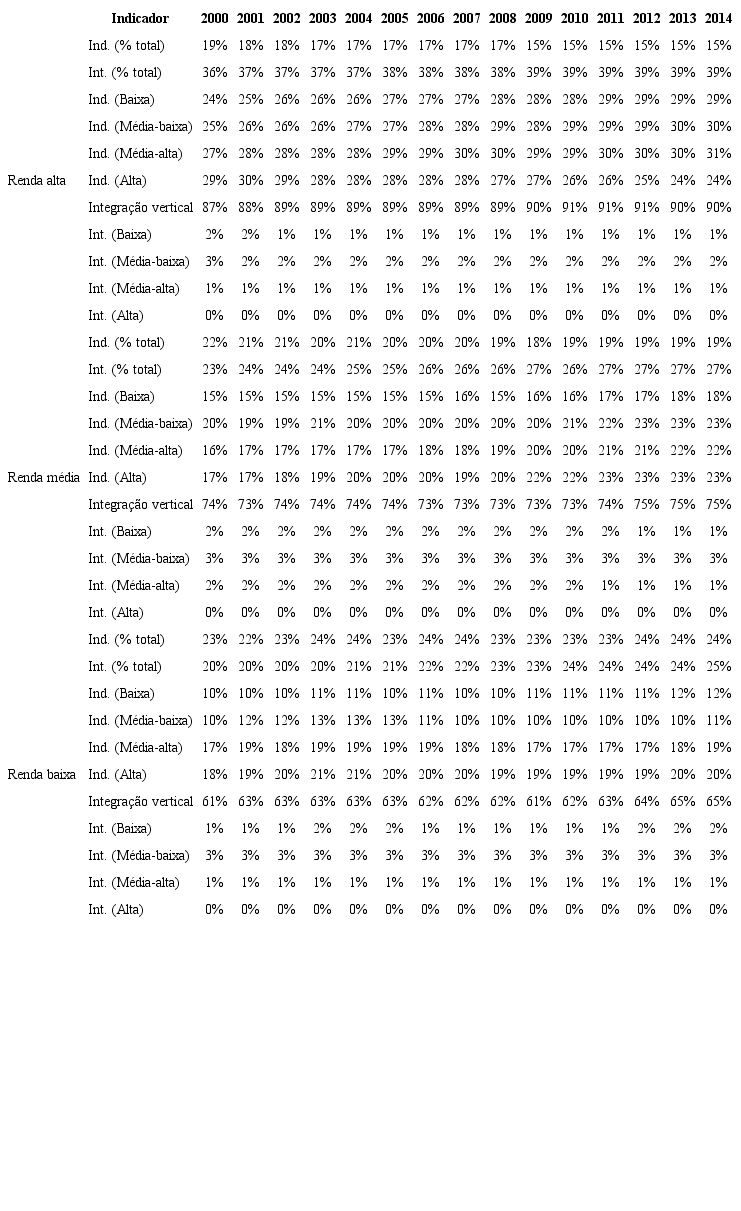 Os países com renda per capita elevada também apresentam integração vertical mais elevada para os subsistemas industriais (Baixa, 55%; Média-baixa, 48%; Média-alta, 48%, e Alta, 56%) e menor participação do ramo primário nas horas trabalhadas nas atividades industriais (Baixa, 6%; Média-baixa, 9%; Média-alta, 2%, e Alta, 1%). Já os países em patamar intermediário (baixo) de renda exibem participação mais elevada do que os demais para o ramo de Serviços finais (Primário).