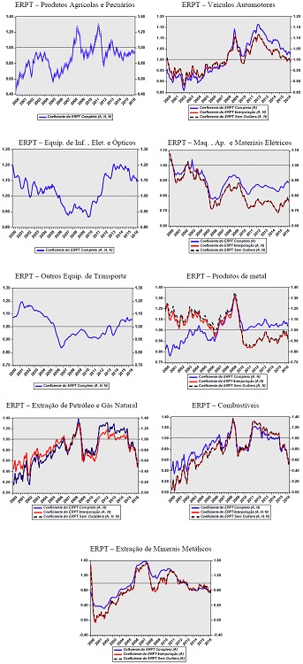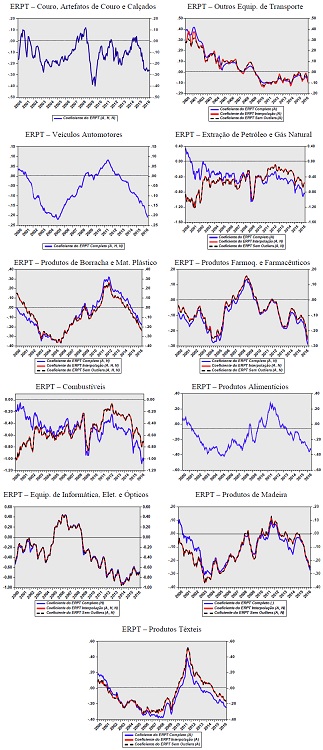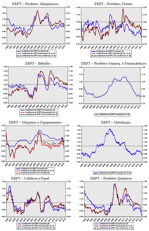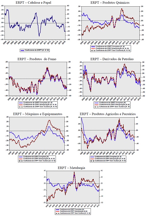 É importante destacar a semelhança encontrada entre o comportamento dos setores de veículos automotores, produtos alimentícios, de borracha e material plástico e farmacoquímicos e farmacêuticos. Essencialmente, esses segmentos apresentaram um grau de ERPT ascendente até 2004/2005, e uma reversão após esse período, seguido por um novo aumento do repasse cambial após o impacto da crise financeira global. Os setores de outros equipamentos de transporte e couro, e artefatos de couro, demonstraram comportamentos distintos. O segundo setor apresentou uma tendência de elevação do ERPT a partir de janeiro de 2000. Essa tendência foi mantida, resultando em um grau de repasse cambial de aproximadamente 30% em 2004. A partir de então, o ERPT assumiu uma trajetória declinante até a queda drástica ocorrida em 2008, seguindo um caráter oscilatório a partir de 2010. O setor de outros equipamentos de transporte é formado essencialmente por aeronaves, e o grau de repasse cambial inicialmente foi positivo (repasse cambial reverso). A partir de 2004, o ERPT estabilizou-se próximo de zero (ou marginalmente inferior a esse valor), sustentando essa trajetória até 2016. Trata-se de um segmento formado por oligopólios globais onde a definição dos preços é determinada por fatores estruturais do mercado.