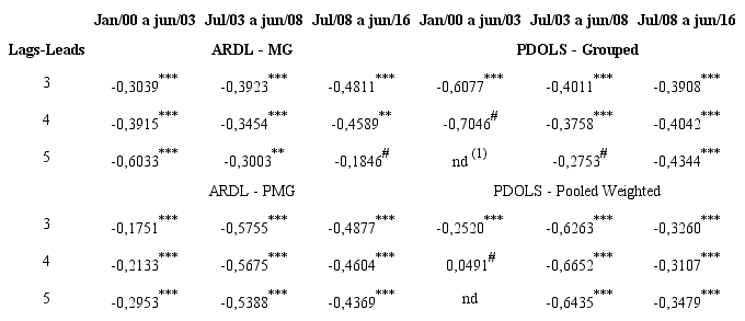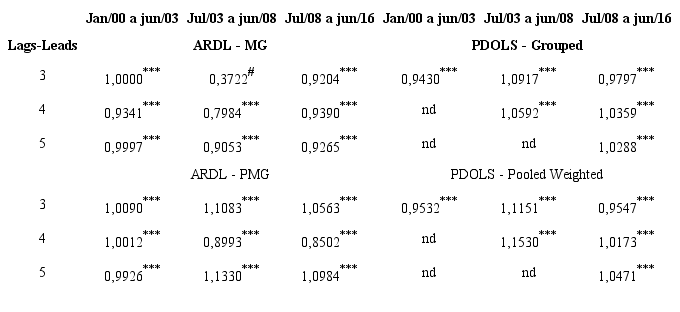 Com o objetivo de avaliar a sensibilidade dos coeficientes, os modelos foram estimados com 3, 4 e 5 defasagens27. Conforme apresentado na Tabela C2 do Anexo C, no geral, os valores corroboraram os resultados obtidos pelo modelo principal, (estimado com 2 defasagens), a exceção do coeficiente encontrado para o segundo período com 5 defasagens pelo método ARDL (MG, valor de 90,53%) e para o segundo período com 3 e 5 defasagens pelo ARDL (PMG, valores de 110,83% e 113,30%, respectivamente).