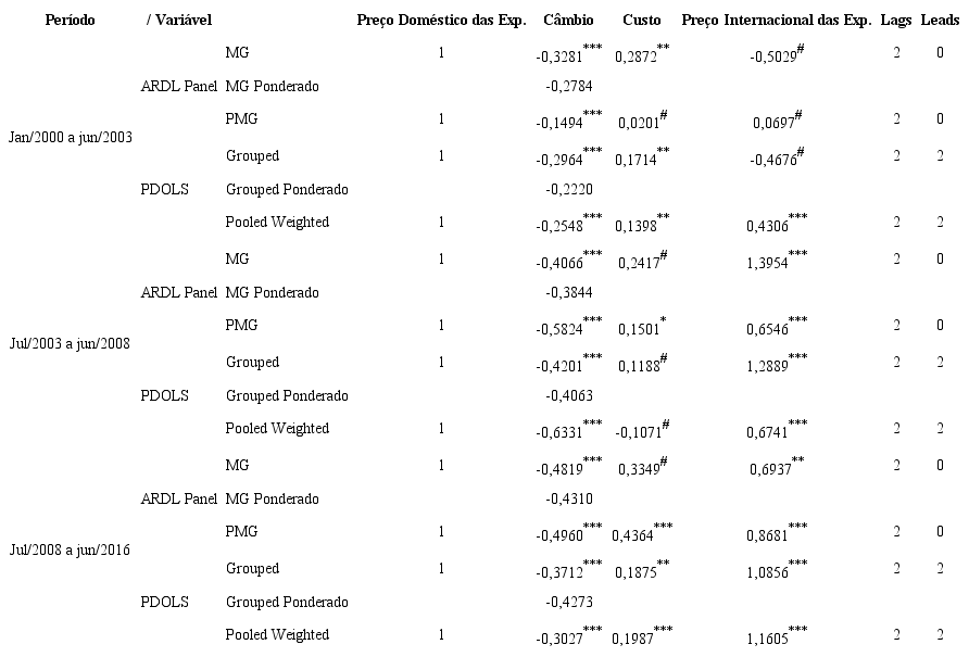 Com relação às variáveis Custo e Preço Internacional das Exportações, ambas apresentaram os sinais consistentes com a teoria econômica (quando estatisticamente significativos). Em especial, uma elevação dos custos de produção e dos preços internacionais das exportações estaria associada a um aumento dos preços domésticos das exportações.