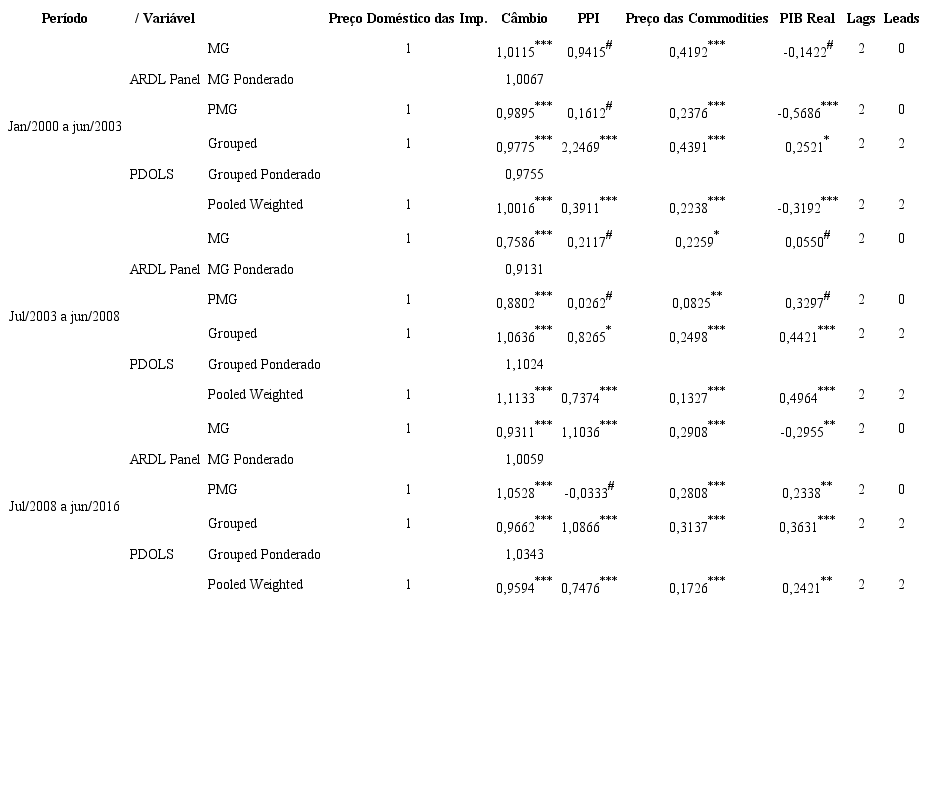 Por fim, Kannebley Jr. et al. (2016) analisaram o ERPT para 19 setores da indústria de transformação brasileira, compreendendo o período de 1999:Q1 a 2012:Q4, por meio da metodologia VEC e FMOLS. Os autores encontraram um repasse cambial médio de 63% e 75%, respectivamente. Os valores dos coeficientes encontrados na presente pesquisa diferenciam-se dos obtidos por Kannebley Jr. et al. (2016) devido possivelmente, às diferenças existentes entre os estudos: 1) as estratégias metodológicas foram distintas (Kannebley Jr. et al. (2016) estimam o repasse cambial individualmente para cada setor, com dados trimestrais, por meio da metodologia VEC e FMOLS); 2) os setores incluídos foram distintos (Kannebley Jr. et al. (2016) focam na indústria de transformação e não incluem, por exemplo, os setores de combustíveis, produtos agrícolas e pecuária, derivados de petróleo e extração de petróleo e gás natural que representaram aproximadamente 30% da pauta de importações no período).