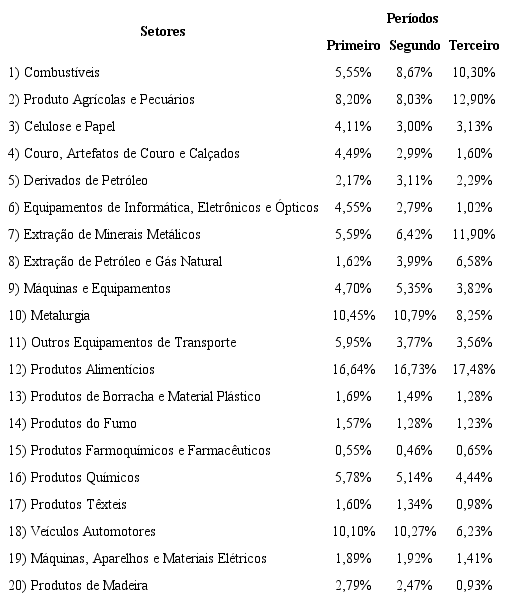 Observou-se, de uma forma geral, que os coeficientes encontrados indicam maiores repasses em setores produtores de bens de menor conteúdo tecnológico em oposição aos produtos manufaturados, corroborando os resultados encontrados por Correa (2012). Esse autor salienta que os setores produtores de bens dotados de maior intensidade tecnológica apresentam menor sensibilidade às mudanças cambiais. Esses setores possuem uma dinâmica particular de preços, visto que além da diferenciação dos produtos, eles são caracterizados por maior participação estrangeira. Assim, as estratégias competitivas podem envolver a absorção de variações cambiais nos markups com o objetivo de preservar mercados.