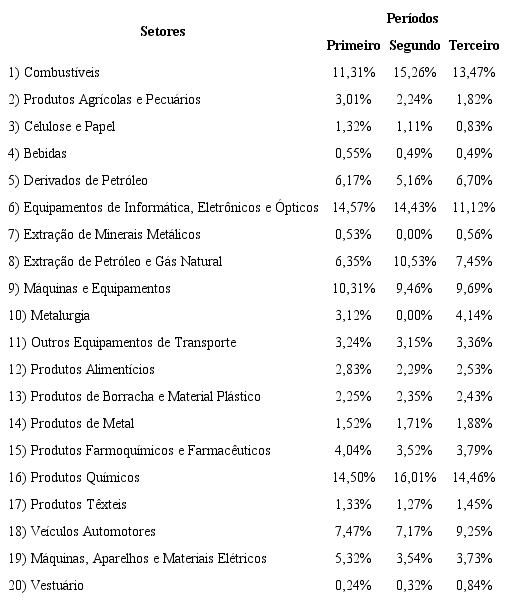 Em linhas gerais observou-se um nível menor de ERPT no primeiro período, que fora marcado por um grau elevado de volatilidade cambial18, possivelmente devido ao fato dos exportadores perceberem a variação cambial daquele período como transitória, a decisão de não alterar os preços tenha sido a estratégia dominante (Froot; Klemperer, 1989; Anderton, 2003). Ademais, uma possível explicação para a elevação do ERPT entre o primeiro e o segundo termos estaria associado à alteração da pauta de exportações. Com base na Tabela A1 do Anexo A, observa-se um aumento significativo da participação dos produtos básicos (combustíveis, agricultura e pecuária, minerais metálicos e petróleo) e uma redução dos produtos manufaturados (equipamentos de informática, outros equipamentos de transportes e veículos automotores), entre o primeiro e o segundo períodos. Dessa maneira, a elevação do repasse cambial poderia ser um reflexo da elevação da participação dos produtos básicos, com baixo nível de diferenciação, caracterizados por um grau de ERPT mais alto. É importante salientar que não foi identificada uma alteração relevante no grau de repasse cambial entre o segundo e o terceiro termos, correspondente ao período pós-crise financeira global.