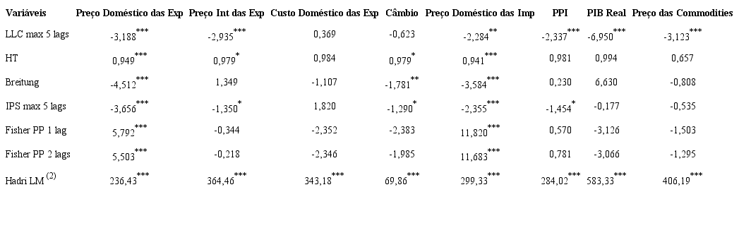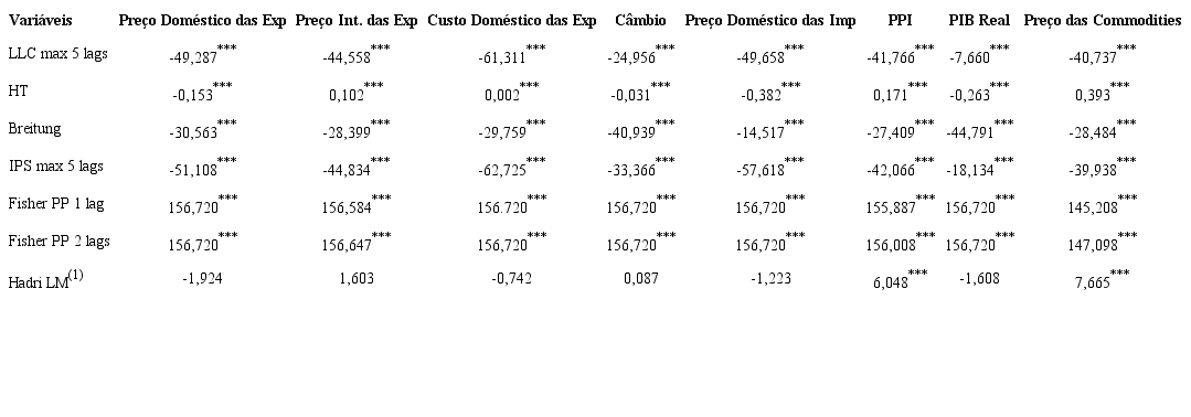 Com relação ao ERPT para os preços das exportações e importações, inicialmente procedeu-se à avaliação da estacionariedade das séries de dados em painel das variáveis. Seis testes foram utilizados na investigação da existência de raízes unitárias: o LLC (Levin; Lin; Chu, 2002), o HT (Harris; Tzavalis, 1999), o Breitung (2000), o IPS (Im, Pesaran e Shin, 2003), o Fisher Phillips-Perron (Choi, 2001) e o Hadri (2005). Baseado na Tabela 3 do Anexo 2, é possível inferir que os painéis das variáveis não são estacionários em nível. São apresentados na Tabela B2 do Anexo B os mesmos testes realizados para as variáveis em primeira diferença. Conclui-se que todas foram estatisticamente significativas a 5% de nível de significância. Dessa maneira, prosseguiu-se com a estimação das equações (5) e (6) por meio dos modelos ARDL para dados em painel e PDOLS.