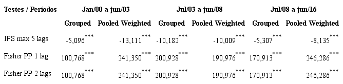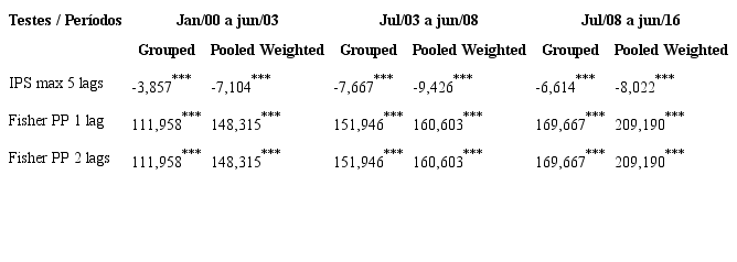 A condição de validade para os resultados obtidos pelo método PDOLS é de que o resíduo da estimação seja estacionário, indicando a existência de uma relação de cointegração entre as variáveis do modelo. Na Tabela 5 do Anexo 2 são apresentados os resultados dos testes de raiz unitária dos resíduos. Constata-se que os resíduos são estacionários, confirmando a validade das relações de cointegração obtidas pelo PDOLS. Ademais, os resultados dos testes de cointegração de Pedroni (1997), de Kao (1999) e de Johansen-Fisher (Maddala e Wu, 1999) indicam que a hipótese nula de ausência de cointegração pode ser rejeitada para os três períodos do estudo.