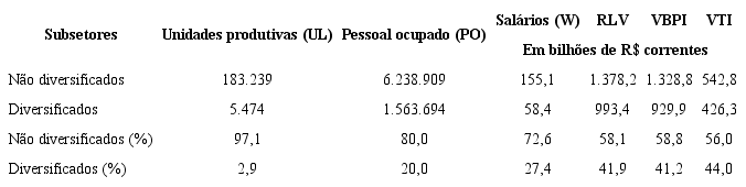 Em 2013, das 188.713 UL com mais de cinco empregados da indústria de transformação brasileira, apenas 2,9% atuaram em mais de um subsetor de atividade entre os 103 subsetores da indústria de transformação (Tabela 1). Essas são as UL que compõem os subsetores diversificados. Embora o número relativo de UL seja pequeno, as plantas diversificadas empregaram 20% do pessoal ocupado da manufatura, pagaram mais de um quarto dos salários, foram responsáveis por 42% da RLV e somaram 44% do VTI na manufatura, formando um grupo de UL industriais representativas da manufatura brasileira em termos econômicos.