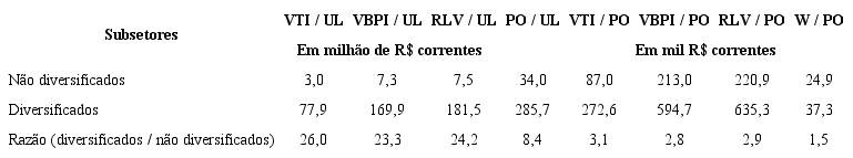Conforme a Tabela 2 mostra, os subsetores com plantas industriais não diversificadas empregaram, em média, 34 trabalhadores contra 286 nas diversificadas. O valor bruto da produção industrial por planta industrial diversificada foi 23,3 vezes maior que nas não diversificadas. E a agregação de valor por trabalhador (VTI/PO) foi 3,1 vezes superior nas UL diversificadas frente às não diversificadas. Por sua vez, o salário médio (salários/PO) é 50% maior para os trabalhadores que atuaram nas UL diversificadas.