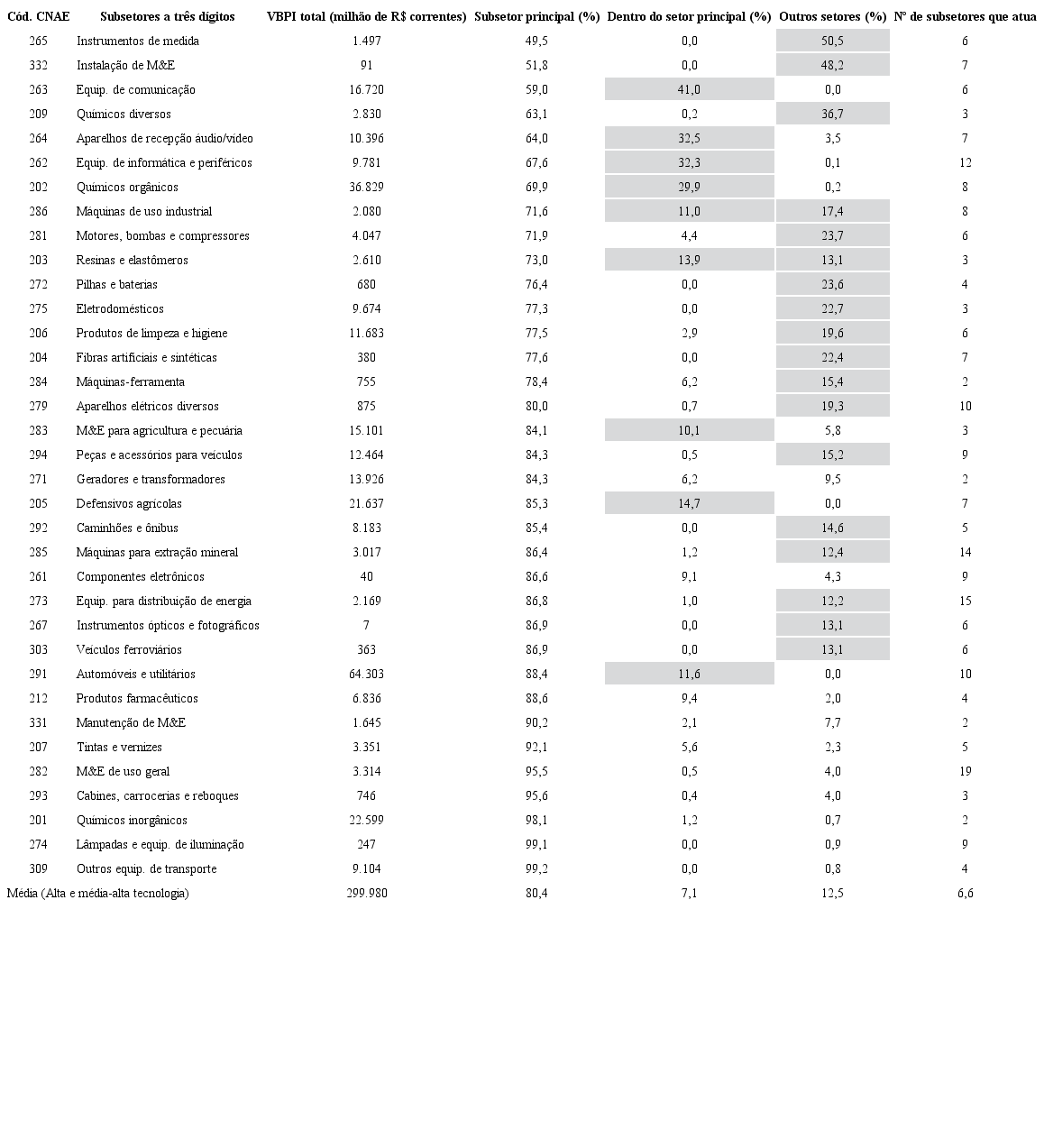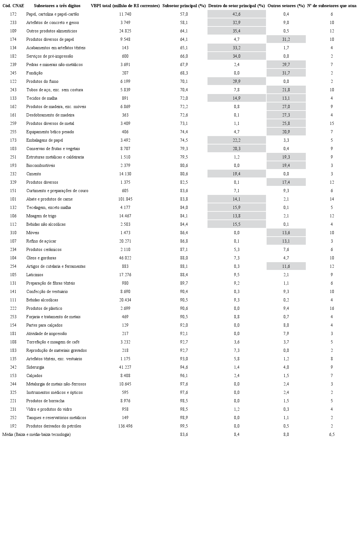 Os três subsetores de baixa e média-baixa tecnologia (Tabela 3) que têm maior capacidade de atuar em outros subsetores são: produtos plásticos; produtos diversos de metal; e abate e produtos de carne. Esses subsetores podem produzir produtos típicos de vários outros segmentos industriais utilizando tecnologias produtivas sobrepostas. Os produtores de artigos plásticos podem atuar na fabricação de tecidos sintéticos, calçados, fibras têxteis e resinas e os fabricantes de produtos de metal podem também atuar na fabricação de tubos de aço, siderurgia, fundição e máquinas-ferramenta, por exemplo.