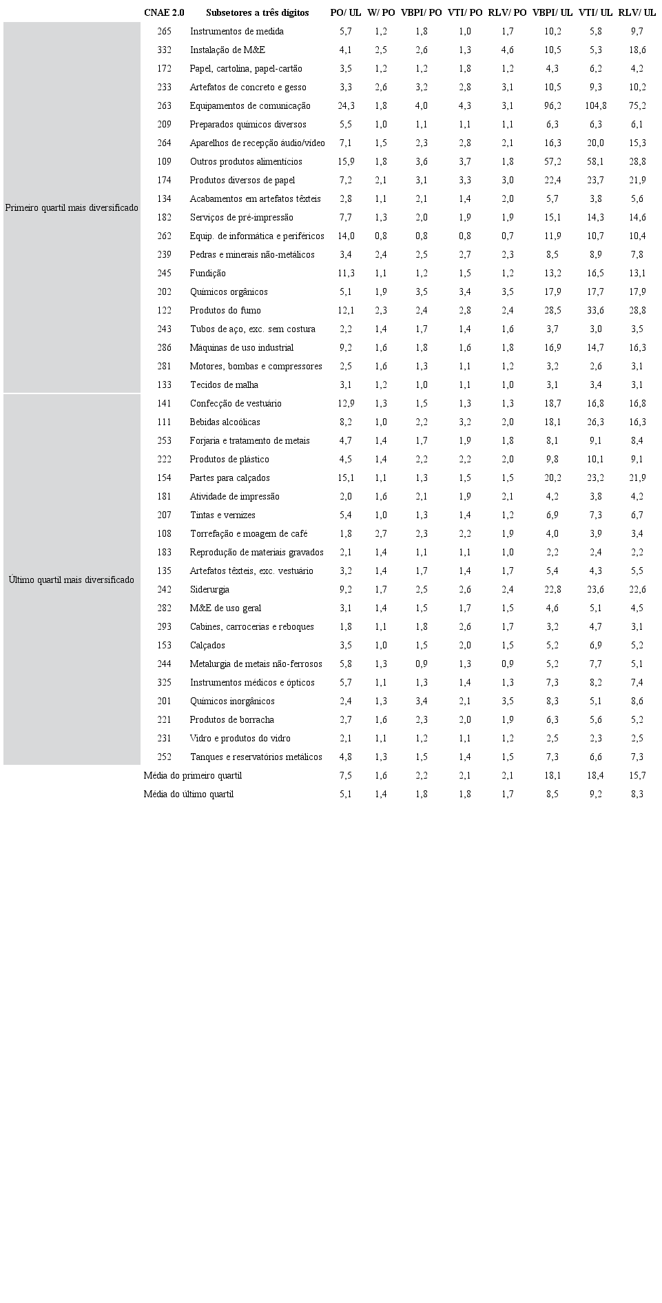 Visando melhor exposição dos dados, a Tabela 5 foi organizada com os resultados apenas dos subsetores do primeiro e do último quartil mais diversificado para o ano de 20135. Os resultados baseados na média destes dois quartis demonstram que há diferença de desempenho quando se considera o nível da diversificação. Espera-se que subsetores que produzam bens de vários subsetores tenham acesso a uma maior diversidade de recursos e tecnologias (Holanda Filho, 1983; Garcia-Vega, 2006), o que pode levá-los a obter vantagem econômica da diversificação. Os subsetores mais diversificados (do primeiro quartil) apresentaram desempenho econômico superior ao dos menos diversificados (do último quartil) em todos os indicadores da Tabela 5. O porte das firmas foi 7,5 vezes maior para o conjunto que diversificou mais, enquanto no último quartil essa diferença é de cinco vezes. A produção industrial por planta produtiva (VBPI/UL) ou agregação de valor por planta (VTI/UL) foi o dobro nos subsetores do primeiro quartil em relação aos do último quartil.