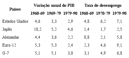 De fato, não é preciso lançar mão de muitas estatísticas para comprovar que a partir da década de 1970, a taxa de crescimento recuou consideravelmente nos países desenvolvidos, acompanhada de um forte aumento da taxa de desemprego, como mostra a Tabela 1. E ainda que, a partir da década de 1990, o crescimento econômico passou a ser alimentado quase que invariavelmente pela formação de “bolhas” (bolhas da internet, do crédito subprime, dos preços do petróleo, dos juros reais negativos nestes países), diante, inclusive, do aumento das desigualdades, as quais, quando estouram, provocam crises e recessões que se prolongam por muito tempo, com prejuízos para a economia e a sociedade, especialmente para as camadas mais pobres da população para as quais costuma-se mandar a conta dos ajustes que são realizados.