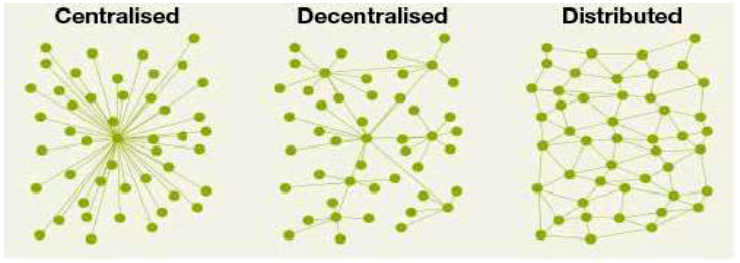 According to Rauchs et al. (2018), decentralized and distributed processes can occur in all three layers (i.e., protocol, network, and data). Albeit similar, these processes are different (Figure 1). When storage or computing is distributed, it is divided into parts and occurs on multiple servers or nodes (organized in a “parallel” fashion). In a distributed way, the system offers not only greater efficiency in its operation but also greater resilience in comparison to the operation from only a single node. However, a distributed process may still have a central coordinator to act as an authoritative source of records.