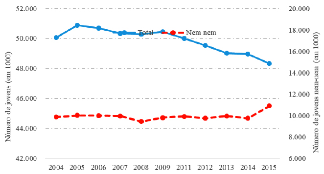 Conforme pode ser verificado no Gráfico 1, enquanto o número total de jovens se reduziu por conta da transição demográfica do país, especialmente a partir de 2011, a população nem-nem (inativos e desocupados) permaneceu relativamente estável na maior parte do período, aumentando somente em 2015, ano de forte queda do PIB. Os jovens de 15/29 anos passaram de 50 para 48,3 milhões entre 2004 e 2015. Os jovens nem-nem aumentaram de 9,9 para 10,9 milhões no mesmo período.