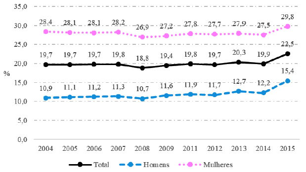 Houve aumento da taxa de jovens nem-nem de 19,7% para 22,5% no período. Note-se, entretanto, que a maior parte do crescimento da taxa ocorreu entre 2014 e 2015. Outro fato notável é a taxa feminina, inicialmente quase o triplo da masculina, baixando para o dobro em 2015. Ao longo do período analisado, houve contínuo crescimento da taxa de jovens nem-nem entre os homens. Em 2015 ela atingia 15,4% para os homens e 29,8% para as mulheres (ver Gráfico 2).