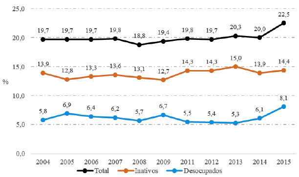 Grosso modo, a população nem-nem é composta por 30% de desocupados e 70% de inativos. Considerando-se todo o período, tanto a taxa de nem-nem inativos quanto a de desocupados apresentaram tendência de elevação. Tal crescimento, entretanto, foi muito mais elevado para os desocupados, especialmente no último ano. Em 2015, quando a taxa de jovens nem-nem era 22,5%, a de inativos atingia 14,4%, a de desocupados, 8,1% (ver Gráfico 3).