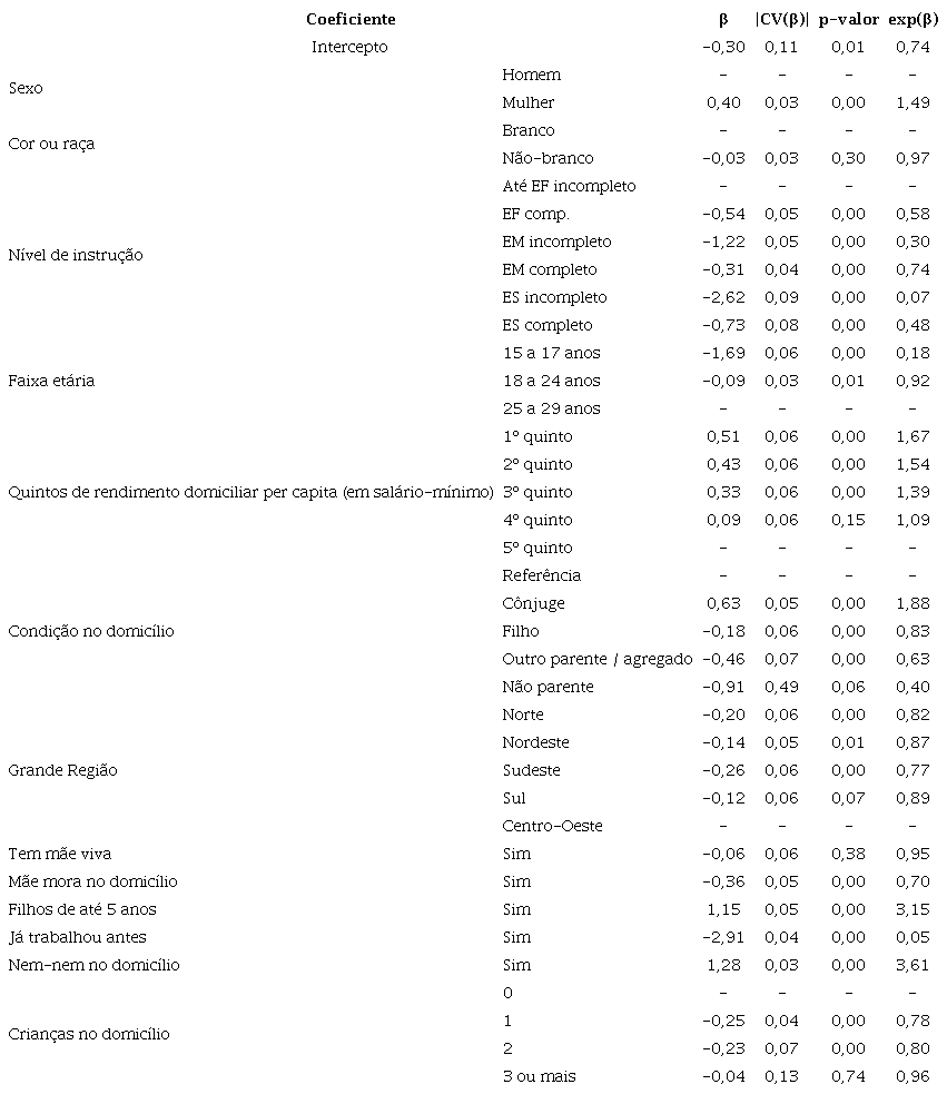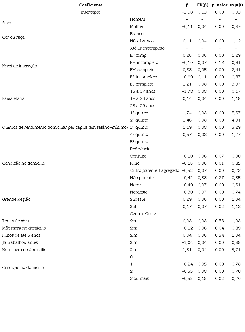 Nesse estudo, Y representa o conjunto dos jovens nem-nem, sendo Y=1 quando for jovem nem-nem e Y=0, caso contrário, e exp βi representa a razão de chance do jovem nem-nem em relação ao estado de referência na variável explicativa Xi.