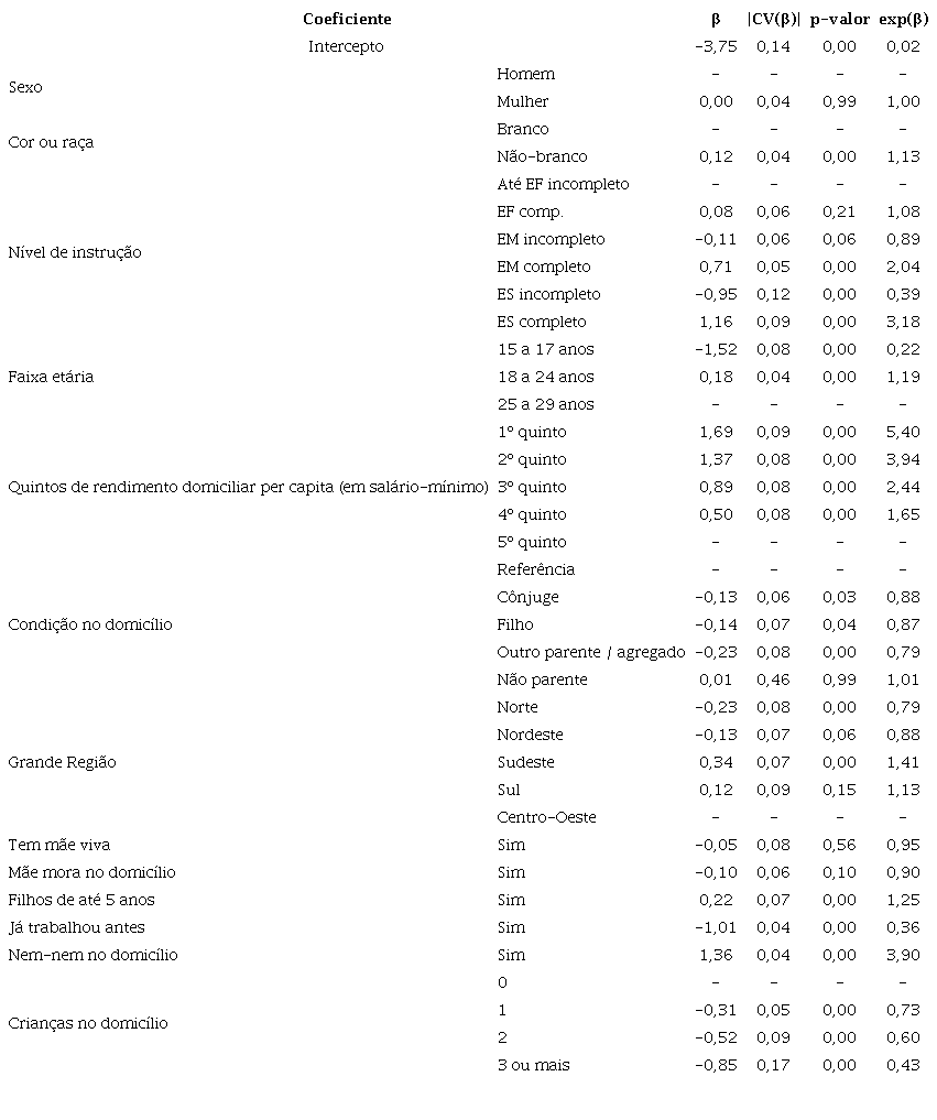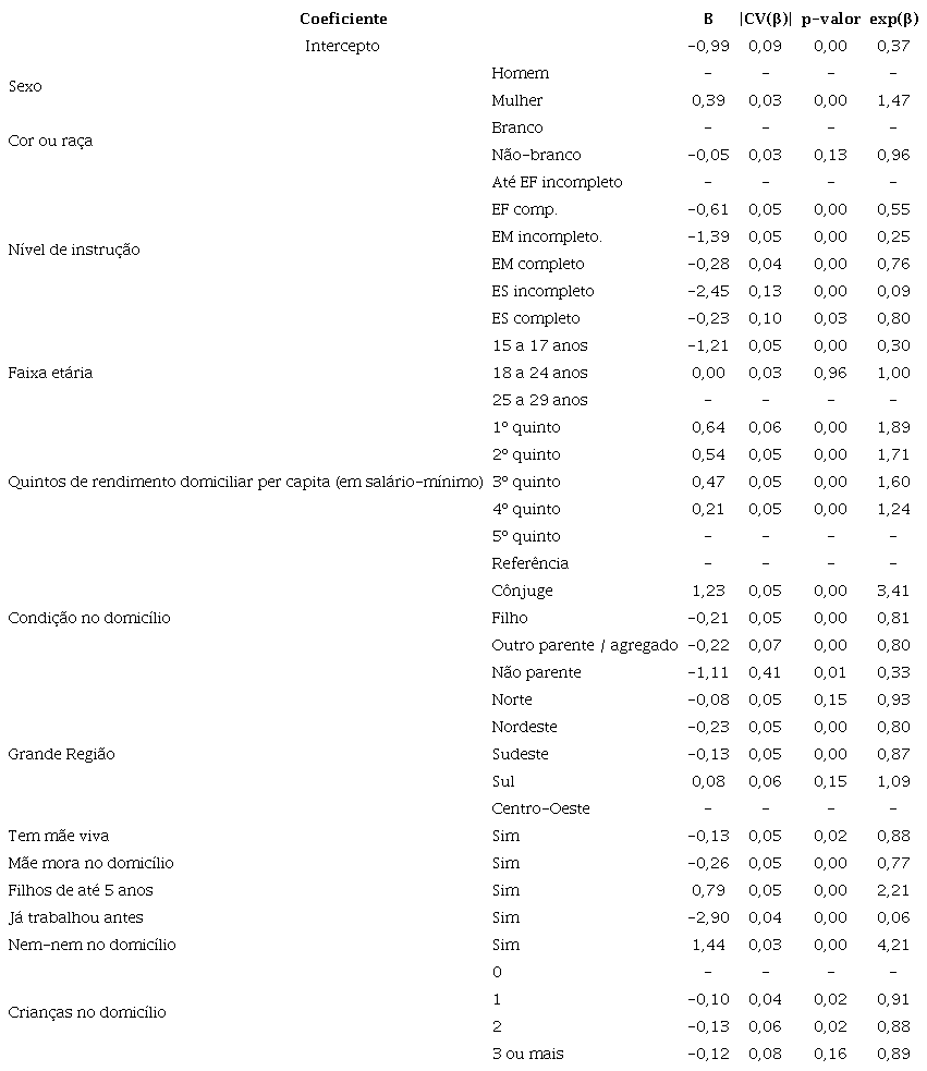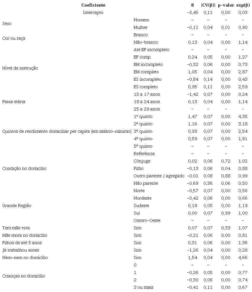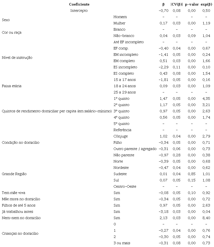 Cabanas et al. (2014) mostraram uma influência positiva quando existe a presença do adulto no domicílio, confirmando os resultados do modelo. Contudo, haveria um impacto negativo da presença de crianças sobre as probabilidades de o jovem ser nem-nem, acentuando-se no caso de haver mais crianças no domicílio. No resultado deste modelo, entretanto, o impacto da presença de crianças foi positivo, o que pode significar a necessidade de uma maior renda e a impossibilidade do jovem se manter inativo.
