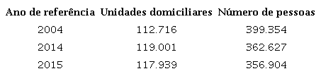 Para a geração das regressões do modelo logístico foram utilizados os microdados da PNAD nos anos de 2004, 2014 e 2015 e o programa R. O Quadro 1 apresenta os totais de unidades domiciliares da amostra com pesquisas realizadas e de pessoas que compunham esses domicílios a cada ano.