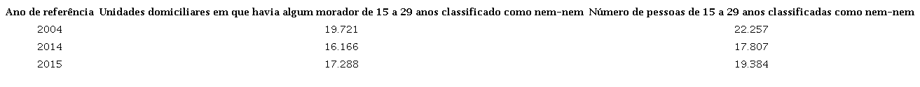 O Quadro 2 apresenta o número de domicílios em que foram identificados jovens nem-nem entre 15 e 29 anos e o número de jovens nesta condição nestes domicílios pesquisados pela PNAD em 2004, 2014 e 2015.