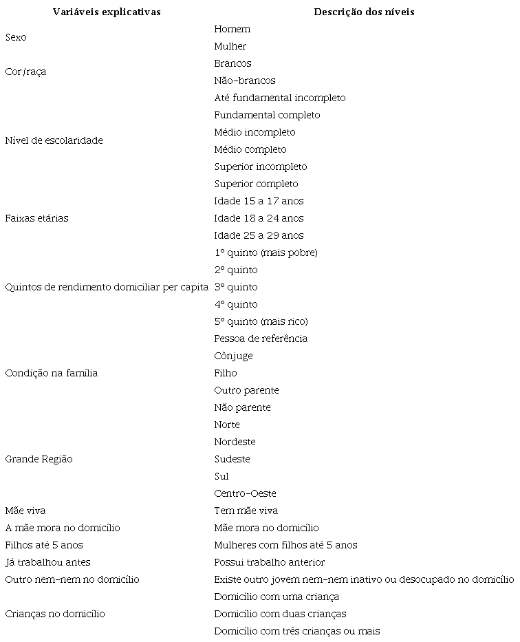 A expansão da amostra utiliza estimadores de razão cuja variável independente é a projeção da população residente de cada Unidade da Federação. A cada ano foram identificados e selecionados os jovens nem-nem entre 15 e 29 anos e todas as pessoas que moravam no mesmo domicílio. As informações dos demais moradores foram utilizadas para contribuir na geração das estatísticas das variáveis explicativas. O objetivo é avaliar os determinantes dos jovens estarem na condição nem-nem a partir de um conjunto de variáveis explicativas que envolvem características pessoais, familiares, domiciliares e geográficas.