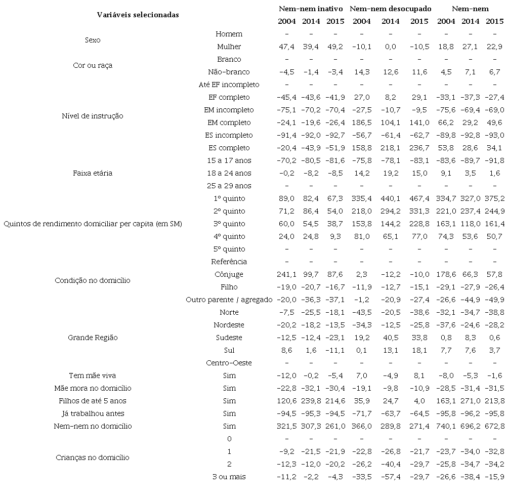 O rendimento domiciliar apresenta uma forte influência em o jovem ser nem-nem inativo, pois quanto maior o nível de rendimento, menor a chance em relação ao jovem nem-nem do domicílio de maior renda (5º quinto). Em 2004, o jovem do domicílio mais pobre, que estava no 1º quinto, apresentava 89% mais chances do que o do mais rico; no 2º quinto a chance se reduzia para 71% a mais; no 3º quinto para 60% e no 2º quinto para 24%. Há claramente uma relação inversa. Em 2014, as chances mantiveram-se nesse patamar, tendo sido observado crescimento apenas no 2º quinto que passou a ter 86% mais de chance. Por sua vez, em 2015, as chances de os jovens manterem-se como inativos diminuíram em todos os níveis de rendimento relativamente ao grupo de referência. Isso talvez esteja associado à busca pelo mercado de trabalho no início da crise econômica, pois a necessidade de compor a renda domiciliar pelos jovens se torna maior devido à diminuição da renda dos responsáveis pelo domicílio.