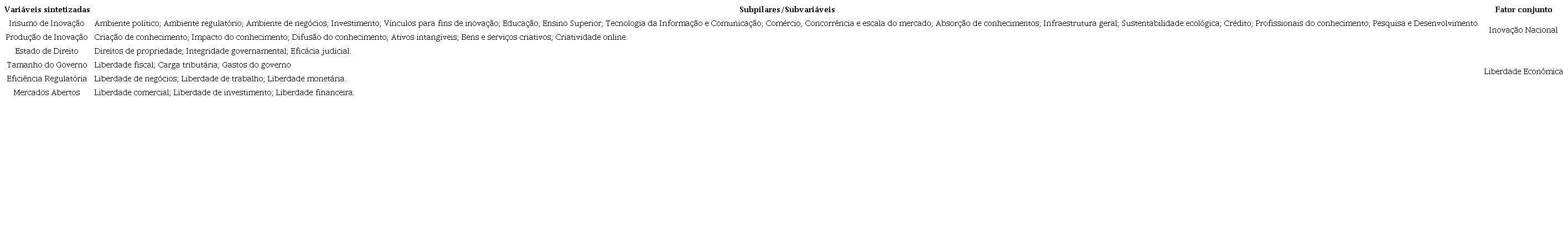 Como mencionado anteriormente, realizou-se primeiramente a sintetização dos indicadores do GII e do Index of Economic Freedom por meio da técnica DP2 . É possível observar os indicadores sintetizados no Quadro 1.