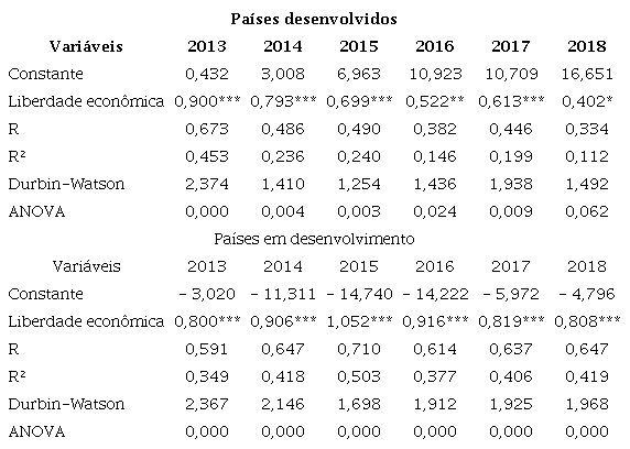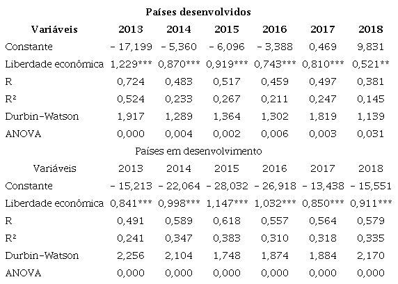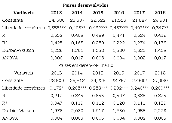 Na Tabela 1, observa-se primeiramente o teste ANOVA, o qual permite constatar a continuidade da análise do modelo diante do método empregado (Marôco, 2014). Da mesma forma, o teste de Durbin-Watson ficou próximo a 2, constatando ausência de autocorrelação serial nos resíduos (Gujarati; Porter, 2011). O coeficiente de correlação (R) entre as variáveis de liberdade econômica e inovação nacional foi maior para os países em desenvolvimento, com exceção do ano de 2013, no qual o resultado apontou correlação maior para os países desenvolvidos.