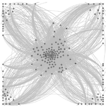 Desse modo, a distribuição utilizada para a elaboração dessa rede, a Force Atlas 2, utiliza o peso das arestas (p - valores de importação) para aproximar os nós (países) e o grau (número de conexões) dos nós para afastá-los. A força de atração (Fa) e a força de repulsão (Fr) entre dois nós (n1 e n2) são definidas por: