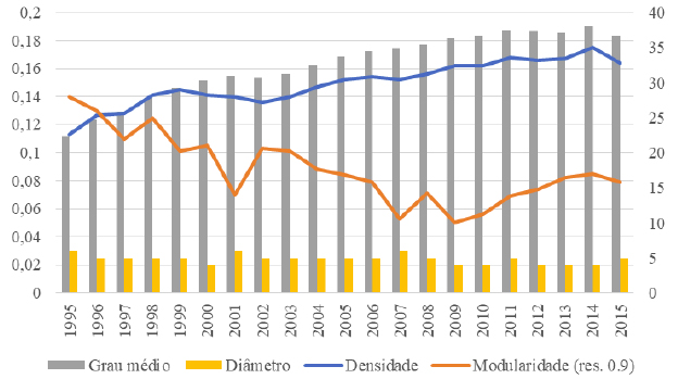 (2) A escala à esquerda do gráfico refere-se aos indicadores Grau médio e Diâmetro (colunas) e a escala à direita diz respeito à Modularidade e Densidade (linhas).
