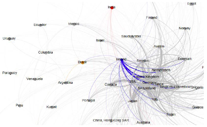 A Irlanda, por sua vez, ao adotar uma estratégia de atração de multinacionais, acaba por estabelecer vínculos comerciais mais significativos com países desenvolvidos, em especial com os países-sede das empresas que direcionaram investimentos para plantas produtivas na Irlanda. Concentrando-se em medicamentos de maior valor agregado, as empresas que atuam na Irlanda exportam principalmente para o mercado europeu e para os Estados Unidos. Desse modo, diferente da Índia, a Irlanda se mantém mais afastada dos países menos desenvolvidos e mais próxima do centro da rede de comércio.