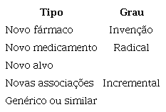 Conforme Vieira e Ohayon (2006), a inovação incremental envolve a utilização de entidades químicas já conhecidas para novos usos (novo alvo), novas associações, e novas formulações. O medicamento genérico é uma cópia equivalente (bioequivalência e biodisponibilidade equivalentes) de um medicamento cuja patente é expirada, e o similar pode conter melhoramentos. A elaboração de um novo fármaco é considerada uma invenção, uma vez que ainda não compõe um medicamento comercializado, enquanto o novo medicamento (ou de referência), isto é, o produto finalizado explorado comercialmente, representa a inovação radical, o grau mais elevado de inovação por conter conhecimento novo - o fármaco inventado.