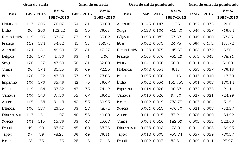 A Tabela 1 apresenta a evolução dos graus de entrada e saída (número de parceiros de importação e exportação, respectivamente), bem como os graus de entrada e saída ponderados (peso da importação e exportação com relação ao total importado/exportado no mundo) para os países que, no ano de 2015, representaram a maior parte do comercio de medicamentos. O Brasil foi incluído na lista de dezoito países para permitir uma comparação com os principais participantes da rede. Os países foram organizados de acordo com o maior valor no último ano (2015). A maior variação percentual do grau de saída observada na Tabela 1, tanto no número de parceiros de exportação quanto no peso ponderado pelos fluxos comerciais, foi obtida pela Índia (122% e 1534%, respectivamente). A especialização em genéricos permitiu à Índia fortalecer sua posição no mercado de economias emergentes, o que contribuiu fortemente para o avanço no número de grau de saída. Além disso, o país também eleva sua presença nos mercados de países desenvolvidos, o que permite considerável aumento na participação do total exportado no mundo.
