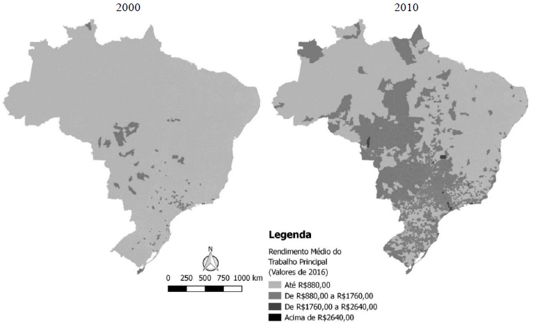 A Figura 1 ilustra a distribuição espacial das diferentes faixas de renda no Brasil. A média brasileira para o rendimento do trabalho principal era de R$ 399,53 em 2000, enquanto a mesma era de R$ 735,78 no ano de 2010, ambas abaixo do salário-mínimo vigente em 2016 de R$880,00 (já que os valores estão atualizados para esta data).