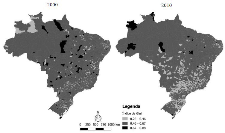 O índice de Gini é uma proxy para a concentração de renda, valores baixos para tal índice representam municípios cuja renda está bem distribuída, o que se torna, consequentemente, um fator aglomerativo para aquela localidade10. Verifica-se que o índice do Brasil diminuiu de 0,53 em 2000 para 0,49 em 2010, complementando o resultado anterior e evidenciando o fato de que não só a renda da população aumentou durante o período estudado, mas a sua distribuição também melhorou. Na Figura 2 abaixo é possível observar tal evolução, principalmente na região centro-sul do país, o que pode ser explicado por diversos fatores que ocorreram simultaneamente no período estudado.