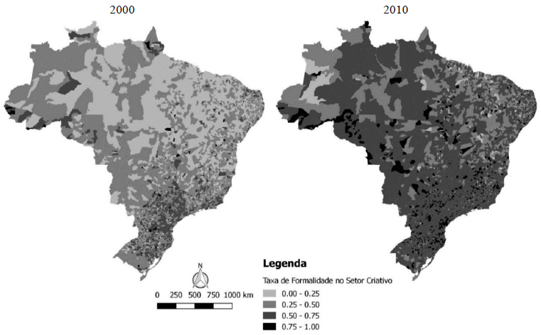 O setor criativo, especificamente, apresentou taxas de formalidade mais altas do que a média para o total de setores da economia, equivalentes a 34,48% e 61,14%, nos anos 2000 e 2010, respectivamente. O indicador acompanhou o aumento vivido pelos outros setores, e a sua distribuição também abrangeu todo o território nacional (porém de forma mais intensa do que o anterior), como pode ser verificado na Figura 3 abaixo.