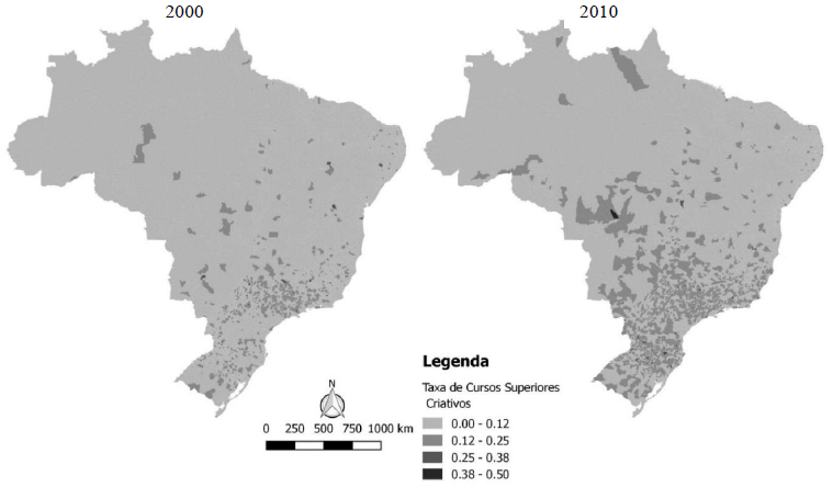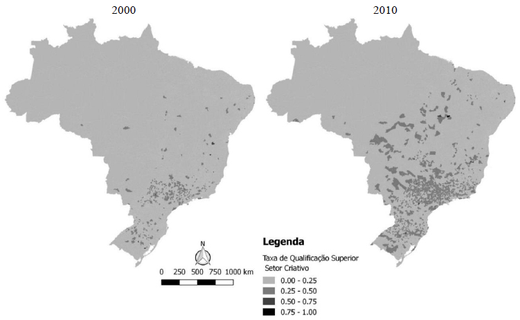 O padrão de distribuição territorial para a proporção de indivíduos com qualificação superior em todos os setores da economia e apenas no setor criativo é o mesmo: concentrado na região centro-sul do Brasil. Porém, para o segundo grupo, as taxas são mais bem distribuídas dentro dessa região e possuem uma participação mais significativa nos municípios do nordeste (e menos significativa para aqueles da região norte).