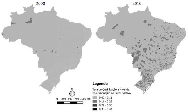 A taxa de qualificação em nível de pós-graduação para o Brasil como um todo variou de 0,05% para 0,90% entre os anos de 2000 e 2010 e se concentrou na região centro-sul do país (mais especificamente no estado de São Paulo). Já a média para o pessoal ocupado no setor criativo é muito maior, passando de 0,54% para 6,19% no período de 10 anos compreendido pelo estudo, apresentando uma variação equivalente a 1046,29% (Figura 5).