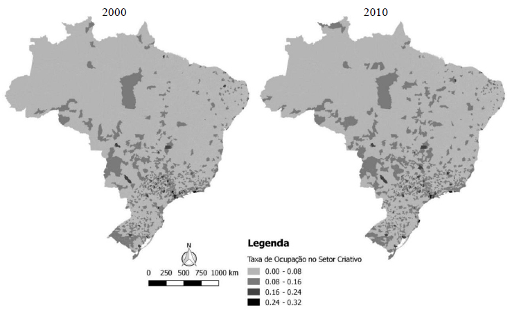 A média brasileira para a proporção de trabalhadores criativos passou de 4,35% para 5,61% entre 2000 e 2010. Em termos geográficos, a sua distribuição se concentrou na região centro-sul do país, tendo mudado muito pouco sua configuração ao longo do tempo. Tal concentração deve-se ao fato de o setor exigir amplas economias de escala, além de atividades dinâmicas, intensivas em capital e de maior valor agregado (Figura 6).