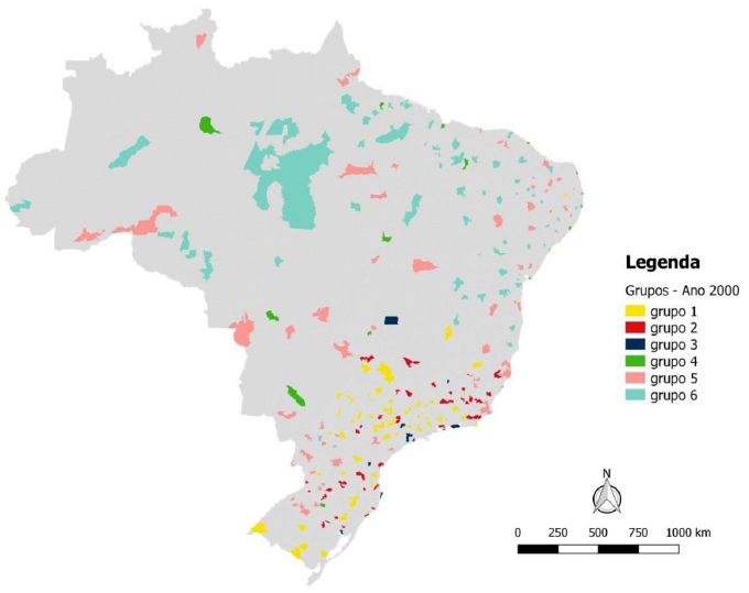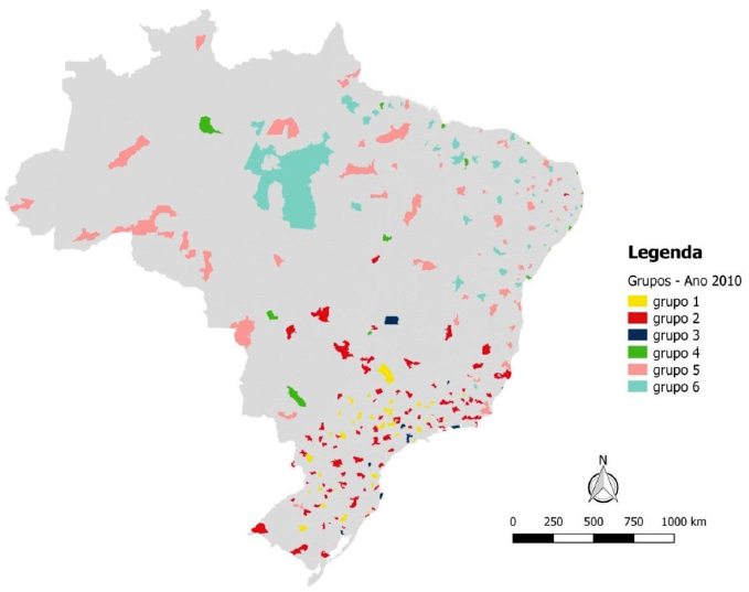 As taxas para tal grupo foram baixas se comparadas aos outros, o que indica que ele não pode ser considerado dinâmico em termos de criatividade. O mesmo ocorre para o grupo 6, que apresentou os piores indicadores do modelo. Tal grupo compreende basicamente cidades do interior do Norte e Nordeste do país, com algumas exceções em 2000 (uma cidade do Mato Grosso, uma de Minas Gerais e duas do Paraná) e com uma exceção em 2010, que foi a cidade de Manhuaçu.