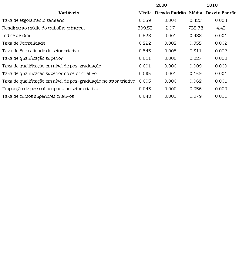 O atual estudo fundamenta-se nos critérios utilizados por Machado, Simões e Diniz (2013) e Golgher (2008, 2011) para construir os seus próprios indicadores, realizando uma análise descritiva das características socioeconômicas dos municípios brasileiros e a sua consequente capacidade de atração às classes criativas.