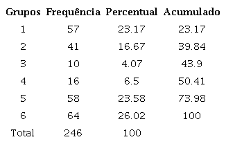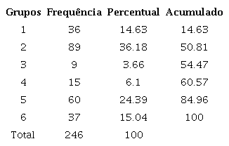 As Tabelas 2 e 4 abaixo mostram a quantidade de munícipios presentes em cada um dos grupos estimados e também os percentuais absolutos e acumulados. Já as Tabelas 3 e 5 mostram as médias das taxas supracitadas, equivalentes a cada um deles. As Figuras 8 e 9 apresentadas posteriormente representam a distribuição dos grupos estimados ao longo do território brasileiro e a variação da sua configuração durante o período estudado.