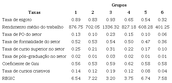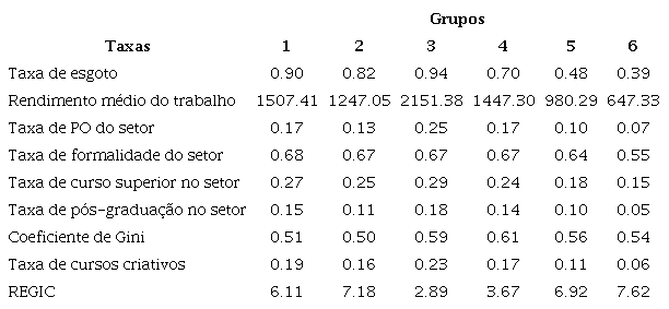 Para a estimação dos grupos foram utilizadas as seguintes variáveis municipais: taxa de esgotamento sanitário, rendimento médio do trabalho principal, proporção do pessoal ocupado no setor criativo, taxa de formalidade no setor criativo, taxa de escolaridade em nível superior no setor criativo, taxa de escolaridade em nível de pós-graduação no setor criativo, coeficiente de Gini, proporção de pessoal ocupado no setor criativo que possui curso superior em áreas criativas, classificação da região de influência das cidades (REGIC).