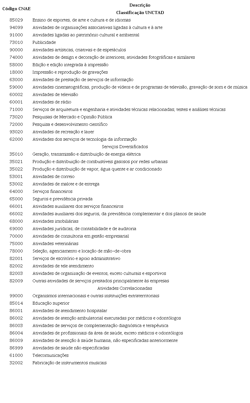 A definição dos setores a serem considerados como parte da indústria criativa passa por ampla discussão conceitual, a UNCTAD, então, tornou-se uma importante referência para os pesquisadores da área. Neste estudo optou-se não só pelo uso da definição da UNCTAD5 para a classificação de tais segmentos, mas também por adicionar os serviços diversificados e atividades correlacionadas ao agrupamento. Portanto, são considerados além das atividades culturais propriamente ditas, os serviços intensivos em tecnologia e que utilizam a criatividade como insumo6.