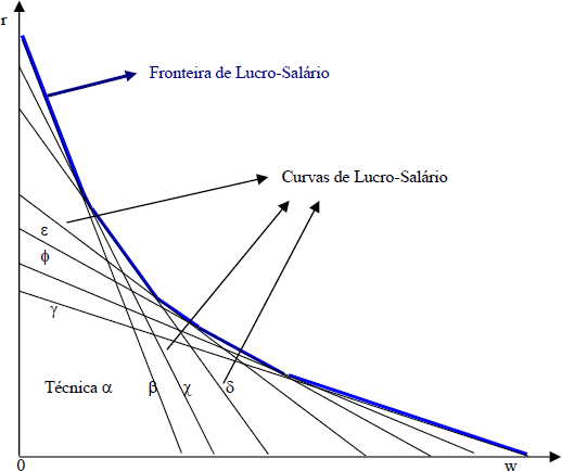Por outro lado, considerando-se o envoltório das curvas de lucro-salário, isto é, aqueles pontos das curvas de lucro-salário que se encontram mais à direita, verifica-se que os segmentos da fronteira de lucro-salário correspondentes à curva α, embora visualmente pareçam representar uma reta, são, na verdade, convexos (da origem). Uma vez que, conforme assinalado, a inclinação da curva de lucro salário (e, portanto, da fronteira de lucro salário nos segmentos onde a técnica correspondente seja a mais lucrativa) representa a relação trabalho/capital, segue-se que, nesses segmentos, à medida que aumenta a relação salário/taxa de lucro, cai a relação trabalho/capital, como, aliás, pressupõe a teoria neoclássica. Não obstante, no segmento em que a curva de lucros salários mais lucrativa corresponde à técnica β, tem-se um aumento simultâneos de ambos, o salário e a relação trabalho/capital. Este fenômeno, denominado, como se viu anteriormente, reversão da intensidade do capital, significa rendimentos marginais crescentes, por implicar uma relação direta entre a remuneração do fator e a sua intensidade relativa, o que definitivamente não é admitido pela teoria neoclássica.