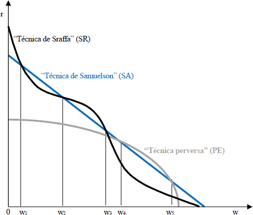 Ressalte-se, por outro lado, que, quando Samuelson publicou o seu artigo de 1962, Sraffa já havia apresentado em seu livro Produção de Mercadorias por Meio de Mercadorias (1960) uma curva de lucro-salário de formato sinuoso, combinando, pois, rendimentos marginais crescentes e decrescentes. A Figura 2, além de registrar essa forma geral da curva de lucros salários (correspondente a uma “técnica de Sraffa”, SR), mostra uma curva de salários reta (“técnica de Samuelson”, SA) e uma curva de salários com uma técnica associada exclusivamente a rendimentos marginais crescentes (“técnica perversa”, PE), revelando, de mais a mais, a possibilidade de reversão de técnicas. De fato, quando 0 < w < w1, SR é a técnica mais lucrativa; quando w1 < w < w2, a técnica escolhida por ser a mais rentável é a SA; para w2 < w < w3, a técnica SR volta a ser a mais lucrativa; já para w3 < w < w4 a técnica SA é, de novo, a de maior lucratividade; quando w4 < w < w5 a técnica PE é a escolhida; finalmente, para w > w5, a técnica SA é, uma vez mais, a melhor opção.