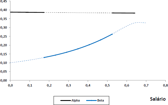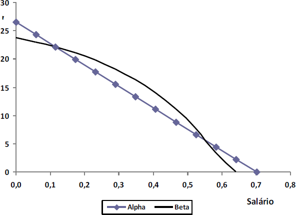 Tomando-se o produto industrial como o “dinheiro” do sistema (p2 = £ 1,00) se obtém as duas curvas de lucro-salário, conforme mostra a Figura 3. Como se pode observar, para salários de até £ 0,1173, a tecnologia α é a mais lucrativa e para salários entre este valor e £ 0,5547, a técnica β é a mais rentável. A técnica α volta, então, a ser a que apresenta a maior taxa de lucro, até que se atinja o salário máximo. Note-se que rMAXΑ > rMAXβ.
