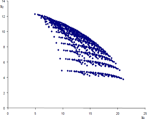 Suponha que D1 = 5; α1 = 0,2; β1= 0,15; γ1 = 0,2; D2 = 4; α2 = 0,1; β2 = 0,05; e γ2 = 0,4. Assumindo, então, que o total de mão-de-obra disponível seja de 20 milhões de horas de trabalho por ano e que a dotação de bens de capital seja de 10 milhões de unidade do “produto da agropecuária” (bem 1) e de 6 milhões de unidades do “produto da indústria” (bem 2), pode-se obter a fronteira das possibilidades de produção conforme mostra a Figura 5, de caráter estritamente convexo (supondo um número indefinido de pontos possíveis).