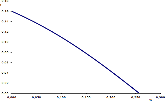 O fato dessa equação descrever uma reta, cuja inclinação é constante, significa que a relação trabalho/capital, dada pelo parâmetro (a02/a11), permanece invariável, não obstante as variações da relação salário/taxa de lucro, w/r. Embora isso pareça contrariar a teoria neoclássica, segundo a qual, devido à LRD, um aumento dos salários e uma queda da taxa de lucros (= taxa de juros) estão associadas a uma queda da relação trabalho/capital, o fato explica-se por ter sido considerada apenas uma técnica de produção, cristalizada nos coeficiente a11 e a02, que são fixos. Mas, ao se tomar um grande número de técnicas, cada uma das quais definida por um diferente par de coeficientes a11 e a02, se obtém uma fronteira convexa (da origem), conforme mostra a Figura 1, confirmando a tese neoclássica14.