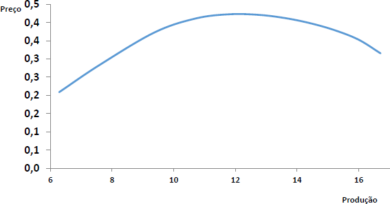 Suponha os mesmos dados referentes à dotação de fatores do Exemplo 2, mas que α1 = 0,3; β1= 0,3; γ1 = 0,3; α2 = 0,2; β2 = 0,3; e γ2 = 0,1. Tomando-se o “produto da indústria” como numerário e assumindo que o salário seja igual a $ 0,1, obtém-se a Figura 7, que retrata relação entre a escala de produção do “produto da agropecuária” e o seu preço de equilíbrio de longo prazo, ou “preço de oferta”, na terminologia de Alfred Marshall. Conforme se verifica, mesmo satisfazendo-se a condição (10), ou seja, mesmo quando prevalecem rendimentos decrescentes de escala em termos físicos, ainda assim a curva de oferta não é monotonamente crescente, podendo, na verdade, assumir diferentes formas27.